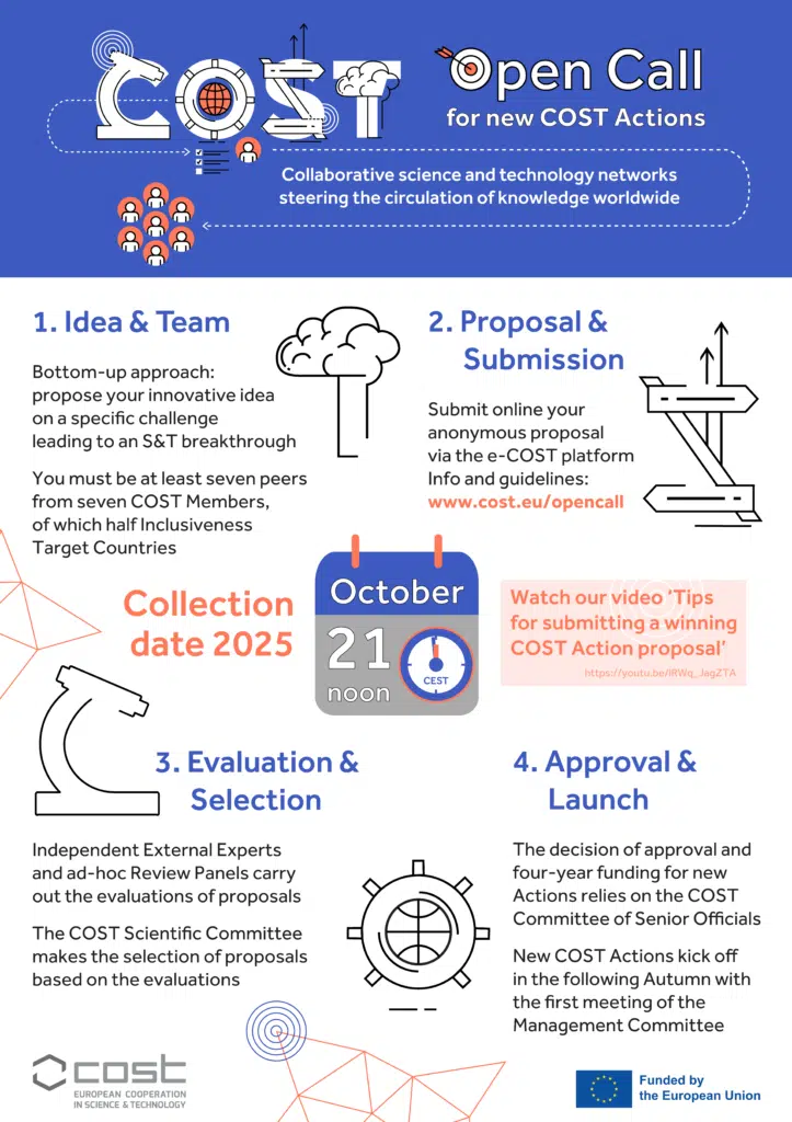 Participants are invited to submit COST Action proposals contributing to the scientific, technological, economic, cultural or societal knowledge advancement and development of Europe. Multi- and interdisciplinary proposals are encouraged.