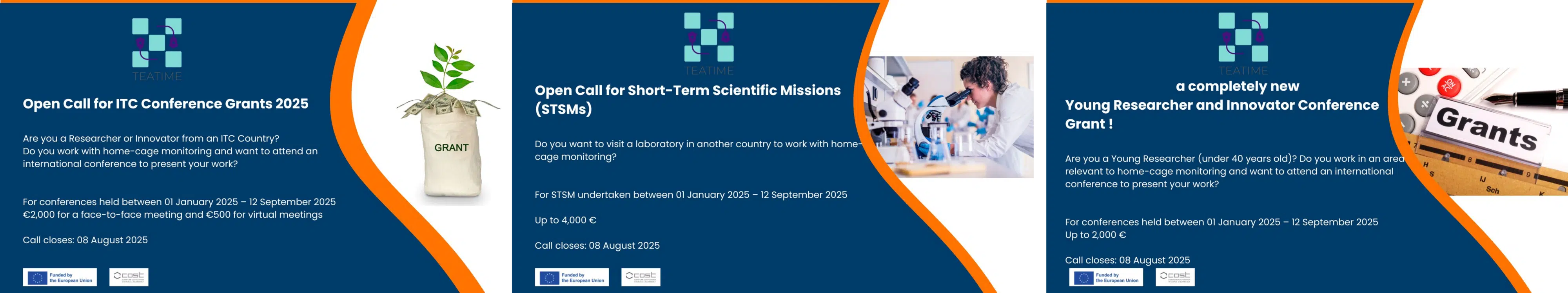 Are you a Researcher or Innovator (under 40 years old)? Do you work in an area related to home-cage monitoring and want to attend an international conference to present your work? TEATIME is offering Young Researcher and Innovator (YRI) Conference Grants (of up to €2,000 each) for young researchers* and innovators to attend a high-level conference and present their work as a poster or oral presentation. The work presented must be relevant to the scope of the Action. The grant can provide a contribution to travel, accommodation and subsistence expenses, registration fees and other relevant costs such as printing of scientific poster. The conference can be before or after the closing date, but it must end before 12 September 2025.