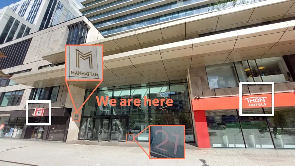 Map showing the entrance of the COST office in the Manhattan building. To the left is a Delhaize supermarket. To the right is the Thon hotel.