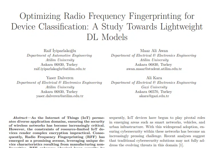 We developed a lightweight 1D Convolutional Neural Network (CNN) model optimized for edge devices, reducing inference latency while maintaining high classification accuracy. Using an open-source dataset of 30 LoRa devices, we evaluated preprocessing methods (Short Time Fourier Transform (STFT) and Fast Fourier Transform (FFT)). Our approach demonstrated: A significant reduction in inference latency, making deployment on real-time edge devices feasible. Comparable classification accuracy when benchmarked against a 2D CNN model. This work not only bridges a crucial gap in the literature but also propels the adoption of RFF for edge devices—an essential step for secure IoT networks in 6G. By aligning this effort with COST Action, we aim to foster collaboration across Europe to achieve secure, resilient, and trustworthy 6G systems.