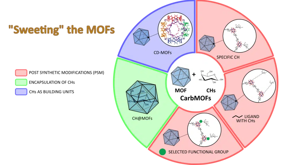 This review highlights recent advancements in combining metal–organic frameworks (MOFs) with carbohydrate chemistry to create biocompatible systems for biomedical applications. MOFs offer unique properties like biodegradability, low toxicity, and high surface area, enabling functionalization with biological ligands and the loading of active cargos, from small drugs to biomacromolecules. Recent research focuses on leveraging carbohydrate chemistry to functionalize and modify MOF structures, aiming for efficient and naturally inspired designs. The review discusses the field’s progress over the past five years, addressing both its potential and challenges, including sustainability and real-world applicability.
